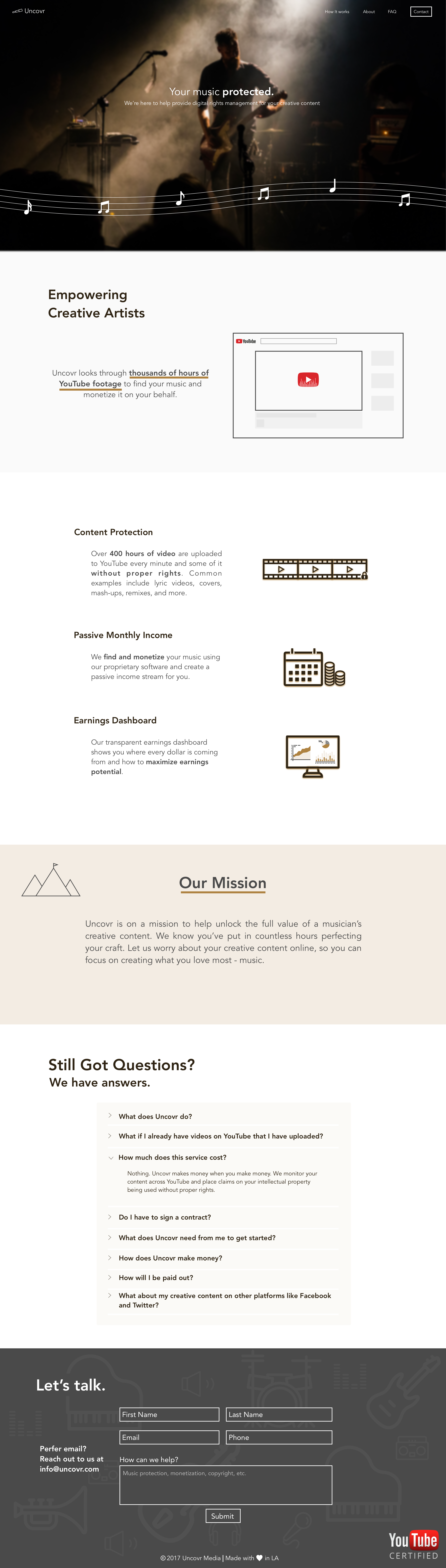 Uncovr was a service for artists that protects their creative content across YouTube. 300 hours of video are uploaded to YouTube every minute and some video content is bound to be used without seeking proper rights. This is where we came in.